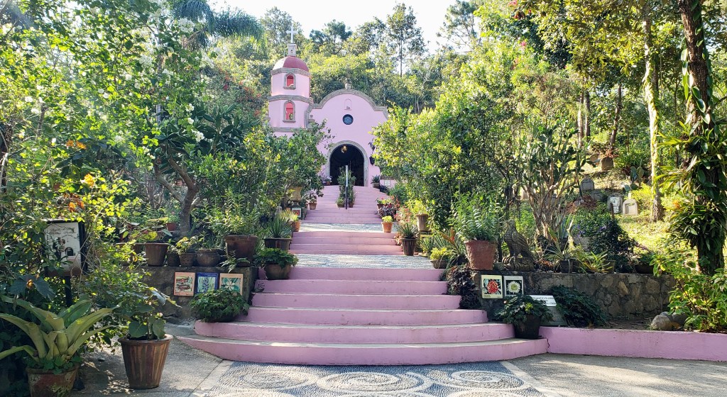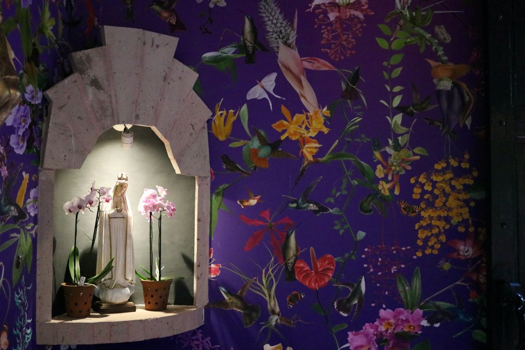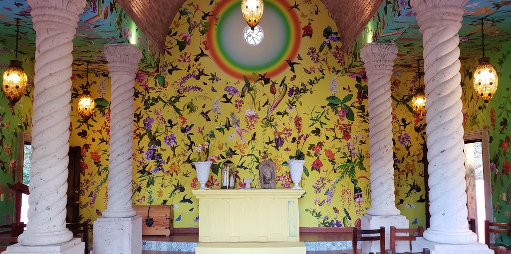 The highlight of the visit was discovering a hidden little structure – a multi-faith chapel Nuestra Señora del Jardín (Our Lady of the Garden), where one immediately feels calmness and tranquility. The wall painting inside the chapel re-creates the natural world that is full of hummingbirds dancing around orchids and other exotic plants. Merging color fields create a special evocative effect and further enliven the space. This art installation was conceived and performed in 2021 by artists David Allen Burns and Austin Young.